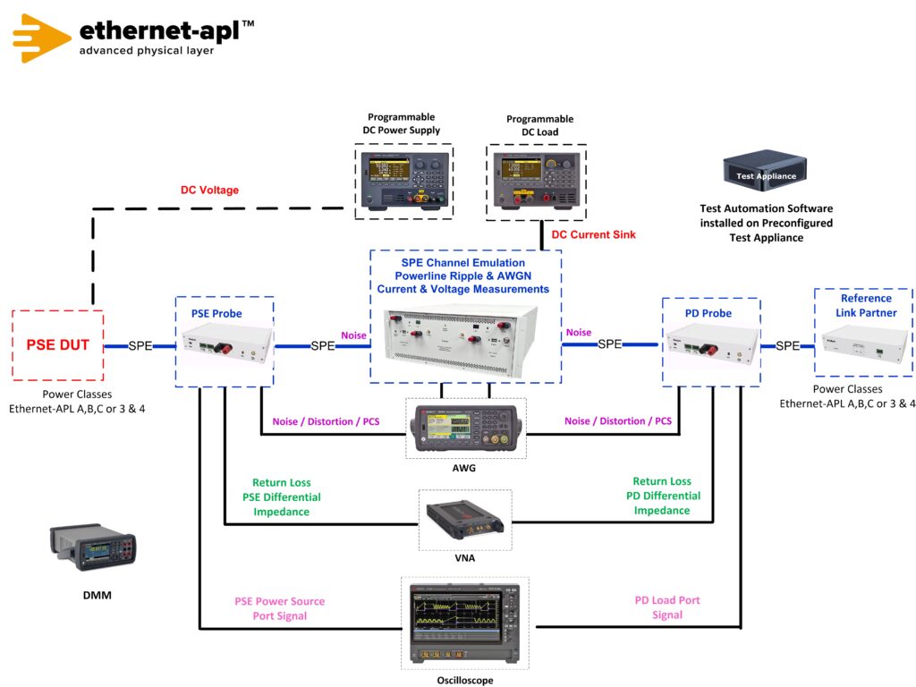 Telebyte’s Ethernet-APL Universal Test Setup supports PSE Source with one setup for Ethernet-APL Conformance and Interoperability Data and Power testing. The small footprint saves valuable laboratory test space while the fully automated approach saves time and money and provides repeatable test results. The solution is easy to use, allowing tests to be performed by technicians with minimal training. There is no need to plug/unplug different instruments and fixtures in the test setup. Additional features include automated software for controlling DUTs and all test equipment. The software generates Pass / Fail Reports for Ethernet-APL Conformance Power and Data tests. A customer’s PC with a serial and network connection is used to transfer data to the PC for post processing the captured Ethernet signal with Telebyte’s Test Automation Software. Customers may purchase all integrated test setup instruments from Telebyte. Please note this same setup can be used for testing PD Loads. An optional switch matrix is available for switching in of multiple DUTs in a test bed.